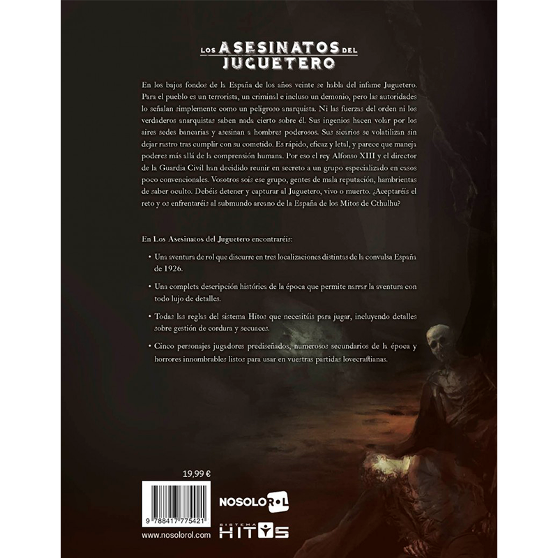 En los bajos fondos de la España de los años veinte se habla del infame Juguetero. Para el pueblo es un terrorista, un criminal o incluso un demonio, pero las autoridades lo señalan simplemente como un peligroso anarquista. Ni las fuerzas del orden ni los verdaderos anarquistas saben nada cierto sobre él. Sus ingenios hacen volar por los aires sedes bancarias y asesinan a hombres poderosos. Sus sicarios se volatilizan sin dejar rastro tras cumplir con su cometido. Es rápido, eficaz y letal, y parece que maneja poderes más allá de la comprensión humana. Por eso el rey Alfonso XIII y el director de la Guardia Civil han decidido reunir en secreto a un grupo especializado en casos poco convencionales. Vosotros sois ese grupo, gentes de mala reputación, hambrientas de saber oculto. Debéis detener y capturar al Juguetero, vivo o muerto. ¿Aceptaréis el reto y os enfrentaréis al submundo arcano de la España de los Mitos de Cthulhu?