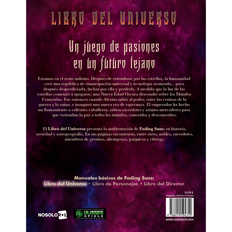 El Libro del Universo presenta la ambientación de Fading Suns: su historia, sociedad y astrogeografía. En sus páginas encontrarás, entre otros, nobles, sacerdotes, miembros de gremios, alienígenas, psíquicos y cíborgs.