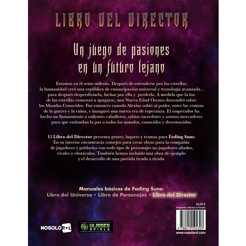 El Libro del Director presenta gentes, lugares y tramas para Fading Suns. En su interior encontrarás consejos para crear obras para la compañía de jugadores y poblarlas con todo tipo de personajes no jugadores aliados, rivales y obstáculos. También hemos incluido una obra de ejemplo y el desarrollo de una partida tirada a tirada.
