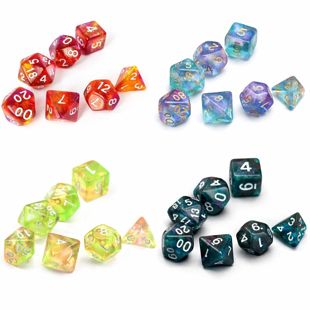 – Contiene: 1 * d20, 1 * d12, 2 * d10 (1 dado de porcentaje), 1 * d8, 1 * d6, 1 * d4 dados;