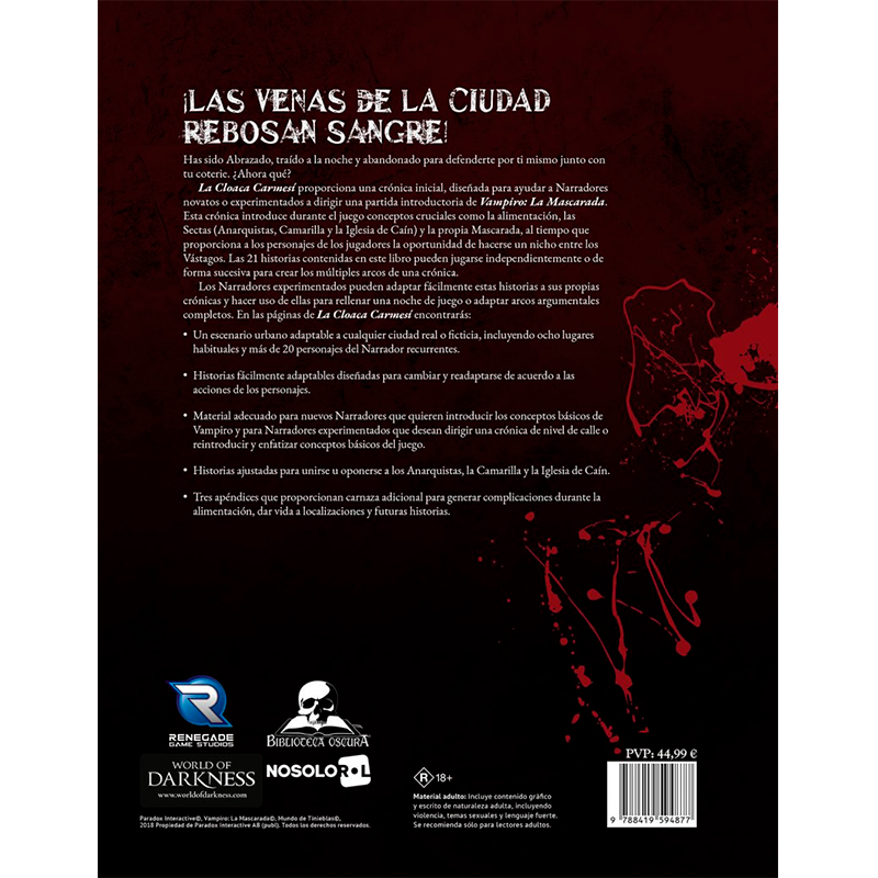 Los Narradores experimentados pueden adaptar fácilmente estas historias a sus propias crónicas y hacer uso de ellas para rellenar una noche de juego o adaptar arcos argumentales completos. En las páginas de La Cloaca Carmesí encontrarás: