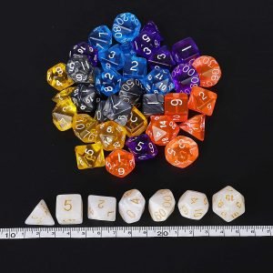 7 dados contiene 1 pieza d20, 1 pieza d12, 2 piezas d10 (00-90 y 0-9), 1 pieza d8, 1 pieza d6, 1 pieza d4; 42 piezas en total